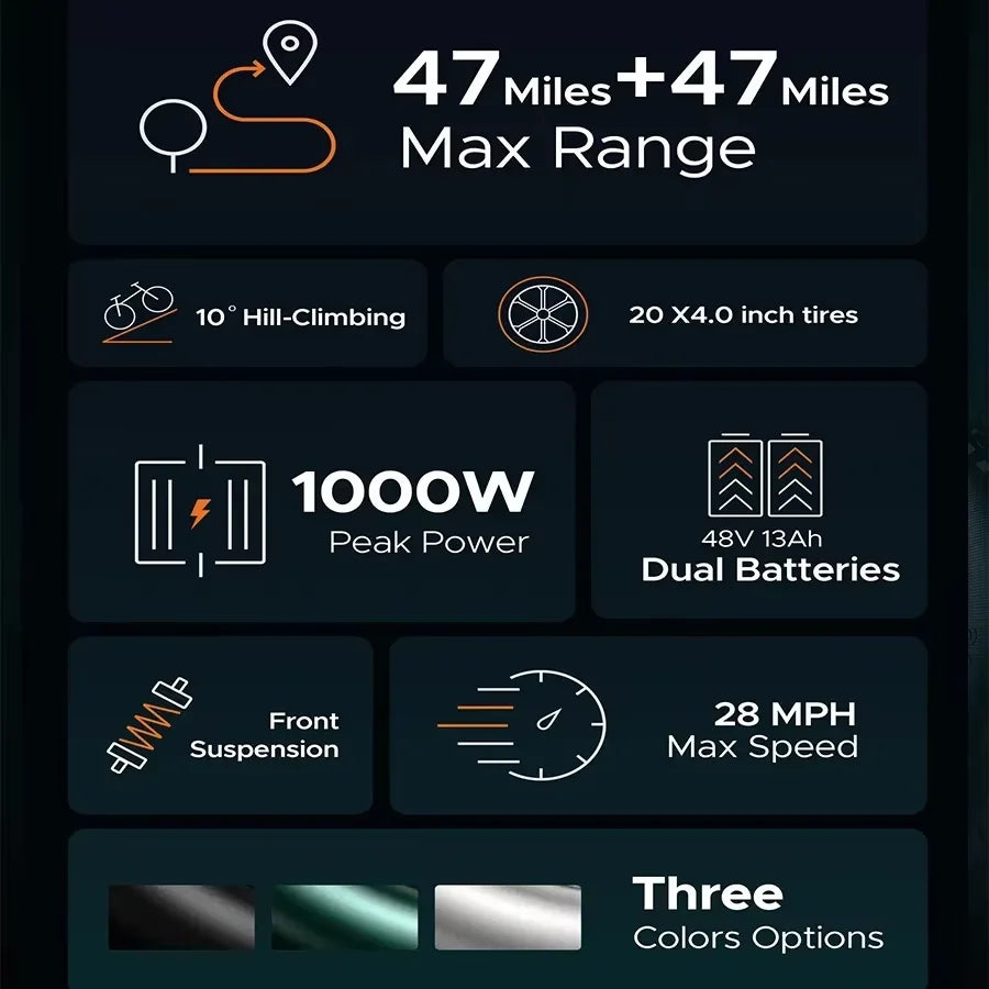 Dual Battery System: Ride farther with long-lasting power, supporting extended adventures without worrying about recharging.
