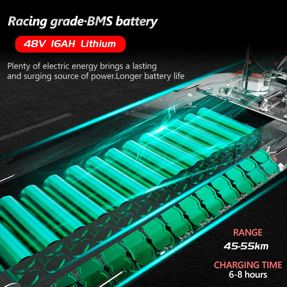 Ride farther on a single charge with the high-capacity 48V battery ā perfect for daily commutes or weekend trips.